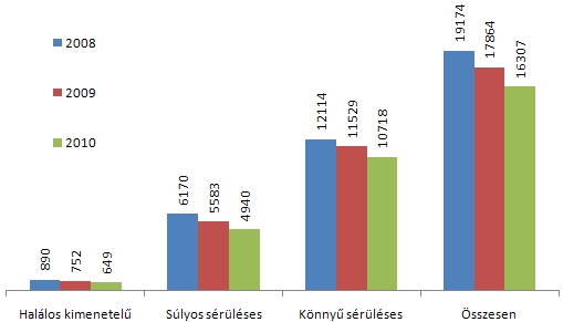 2010-ben több mint 16 300 személysérüléses közúti közlekedési baleset történt, 69%-a lakott területen belül. A lakott területen kívül okozott balesetek száma nagyobb mértékben, 11%-kal, míg a lakott területen belül történteké kisebb mértékben – 8%-kal – csökkent 2009 azonos időszakához képest. Az előző év azonos hónapjaihoz viszonyítva a halálos balesetek száma májusig csökkenő, majd növekvő tendenciát mutat. Szeptember hónapban 64%-kal magasabb volt ugyan a halálos kimenetelű balesetek száma az elmúlt év szeptemberének adatához képest, viszont 2009 szeptemberében 40%-kal kevesebb baleset történt, mint az azt megelőző évben. A közbiztonság növelése érdekében 2009 szeptemberétől több rendőr szolgált a közterületeken. Ötéves idősorban vizsgálva az adatot, átlagosan 84 baleset történt szeptemberben, szemben a 2010. szeptemberi 77 balesettel.