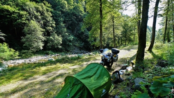 Végül is Bolzano és Trento között találtam egy alkalmas táborhelyet a hegyoldalban. Sorompóval lezárt erdészeti út volt, de elfértem mellette. Haladtam rajta pár száz métert, és az első kiszélesedésnél le is táboroztam. Az első nap 741 kilométert tettem meg, és mivel már sötétedett, nem lett volna értelme tovább menni. Az első adatmentés következett. Elővettem a tabletet, és csatlakoztattam a jó kis SJ 4000-es kamerát. A teljes napi felvételt átküldtem a tabletre, majd töröltem a kamera memóriakártyáját. Ezek után az egy terrás külső merevlemezre másoltam a gépről, majd a gép memóriájából is töröltem. Ezt később minden este megismételtem.