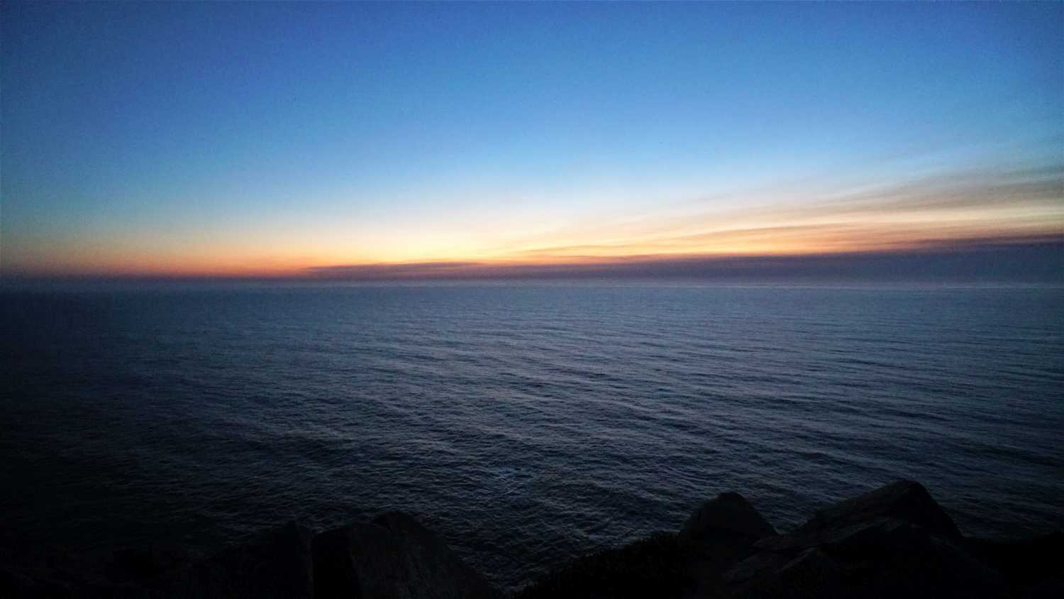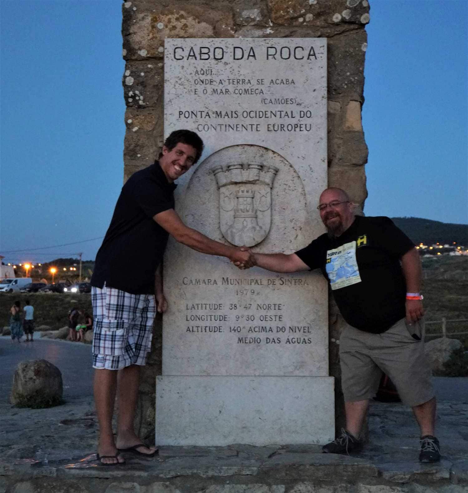 Szürreális érzés, ahogy zúdul le az ember, egy nyílegyenes autópályán, aminek a végén az Atlanti óceán hullámzik. Azért sikerült jobbra fordulni, még az óceán előtt, de tényleg csak néhány méterrel. Elég nagy forgalom volt a parton, és szerintem emiatt késtük le a naplementét, de azért nem volt minden veszve, hisz az SJ Camera végig be volt kapcsolva, így, ha nem is a legnyugatibb ponton, de sikerült felvételt csinálni, arról, hogy szó szerint belemotorozom a naplementébe. Mire kiértünk a Cabo da Rocca szirtjéhez, már majdnem teljesen sötét volt. Ácsorgott ott egy Lengyel lány, az Olasz barátnőjével, és felajánlották, hogy készítenek rólunk pár képet.