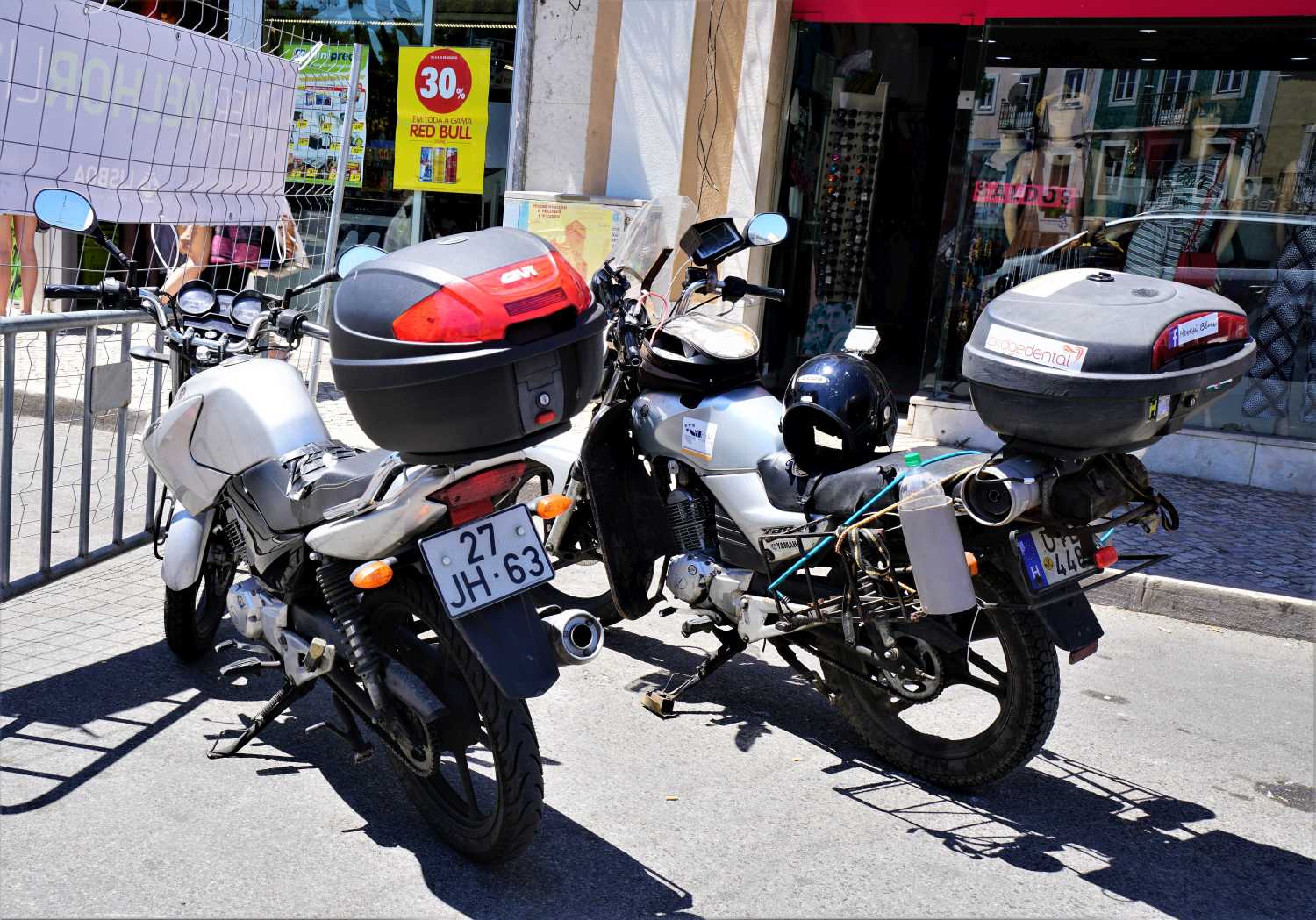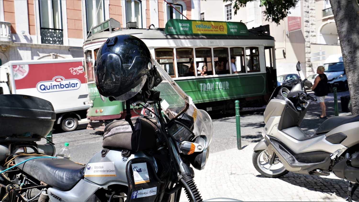 Amire régen vágytam, hogy a lisszaboni villamossal készítsek néhány közös fotót, ezért a centrum táblákat figyeltem. Elég sok villamos pályát nem használnak már, ezért nem érdemes ácsorogni, egy sín mellett, a villamosra várva, hanem egyszerűbb a főtérről induló villamosokat követni, és azokon az útvonalakon bolyongani. Délután négy körül visszamentem a kempingbe, ismét csobbantam egyet a medencében, ami most már tele volt a mindenhonnan érkezett vendégekkel. Ültem a medence szélén, hatalmas pálmafákkal körülvéve, és találgattam, hogy ki, milyen nemzetiségű lehet. Amikor meguntam a bámészkodást, nekiálltam kimosni a szennyest, és ledőltem egy kicsit, az esti program előtt. Este nyolckor kimentem a bejárathoz, és a 3 éve nem látott Tiagora nem kellett sokat várni.. Rövidnadrág, atlétatrikó, vietnámi papucs, alkották a motoros öltözékét.