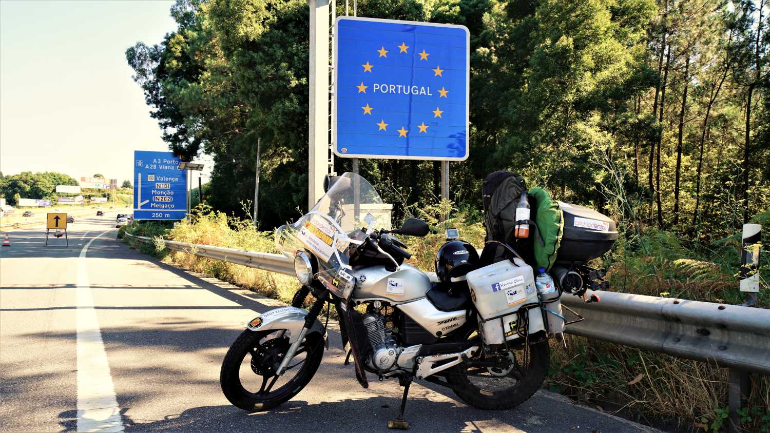 Megtöltöttem a két flaskát, és bedugtam a fejem a víz alá, majd levettem a pólóm, és azt is beáztattam. A fickó nem fogadott el pénzt a frissítőért, így három liter vízzel, és még eggyel a pólómban, most már valóban megállás nélkül értem a Portugál határhoz. Majdnem elhúztam a tábla mellett, mert az autópályán nem szabad megállni, pláne nem fényképezgetés céljából, de szerencsém volt. A külső sávot – a két száz méterrel későbbi ellenőrzés miatt – kibójázták, ezért kényelmesen, veszélytelenül tudtam parkolni a Portugália tábla előtt. A produkciómat figyelemmel kísérte a két rendőr is, akik a határellenőrzést végezték (ha az árnyékban ácsorgást annak lehet nevezni), de csak unottan nézték, ahogy azután elgurultam előttük. A két ország közötti különbség szemmel látható: Spanyolországban az épületek elég szedett-vedettek, mondhatnám, hogy rendetlenek, elhanyagoltak.