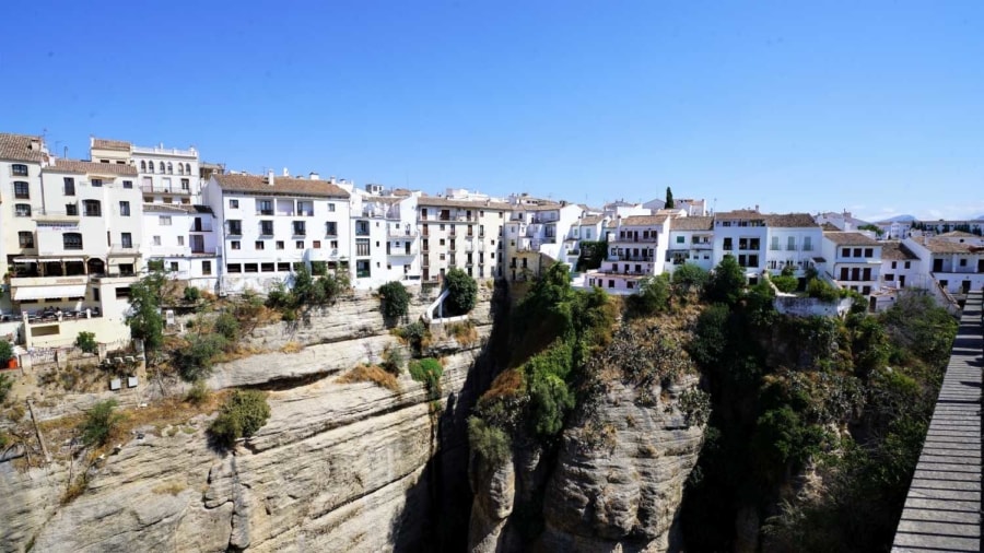 A hágó északi oldalán már tikkasztó hőségben és szárazságban motoroztam. A lapályon, egy látványos szakadék körül épült fel Ronda városa, ami a nevével ellentétben egy szemet gyönyörködtető kis ékszerdoboz. A száz méteres sziklafalakon a hófehér házacskák piros tetővel sorakoznak. Minden gyönyörű és patika tisztaságú, gondolom a nagy turistaforgalom miatt ragaszkodnak a példás rendhez.