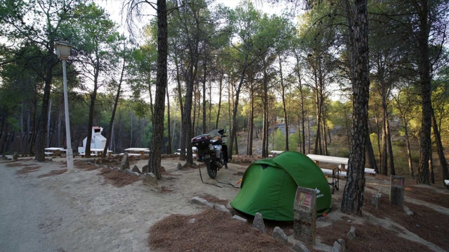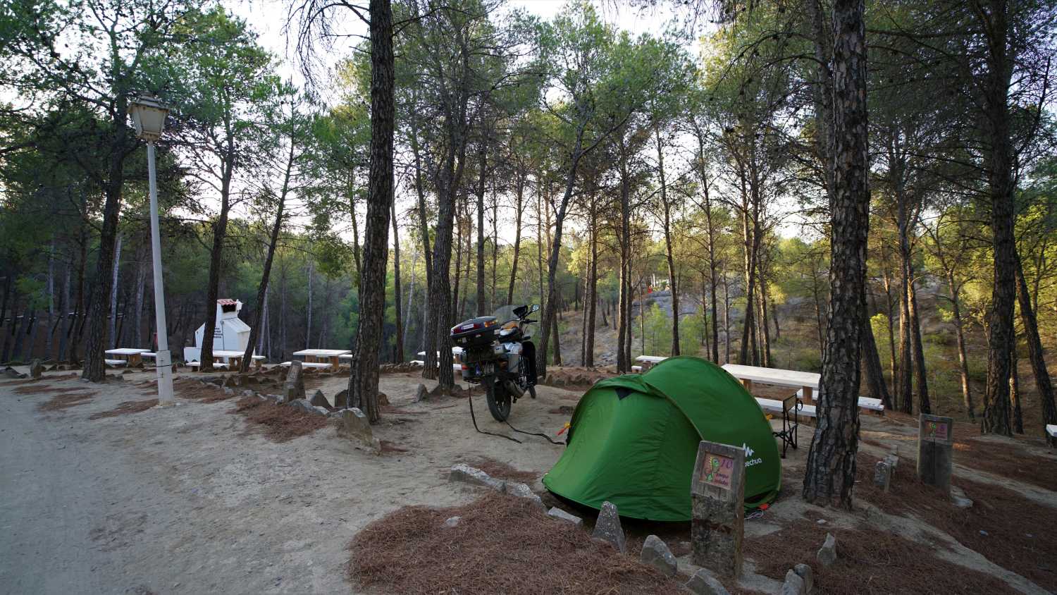 Az élményt kissé beárnyékolta, hogy a finom kavicspor beszivárgott a cipőmbe – talán emlékeztek, a zokni a motoron maradt -, és csúnyán feltörte a talpam, valamint a lábujjam a séta végére. A motornál elbúcsúztam új ismerőseimtől, és a buszról már korábban kiszúrt, a kanyon másik végénél lévő kempinghez hajtottam. Úgy látszik, ez a meglepetések napja, mert ilyen kempinget sem láttam még azelőtt… A hegyoldalba építették, de nem fektettek túl nagy hangsúlyt a kényelemre, mert egyik sátorhelyhez sem lehetett kocsival vagy motorral odaállni.