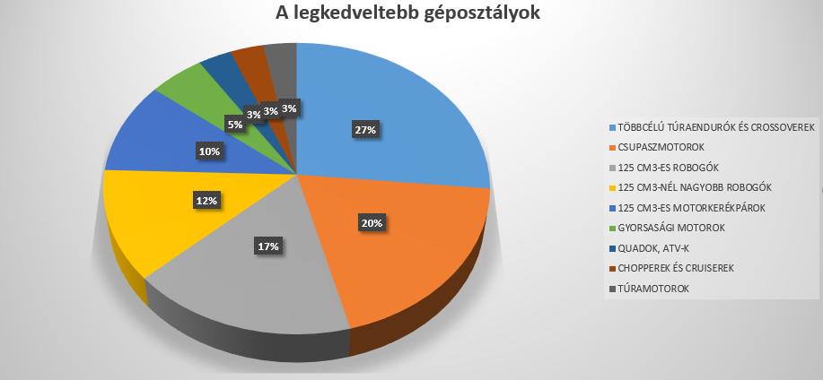 Ami az egyes géposztályok összesítését illeti, továbbra is a túraendurók és a crossoverek uralják a trónt, nyomukban a csupaszmotorokkal, valamint a nagyrobogókkal. Az első két csoport fölénye olyan masszív, hogy gyakorlatilag abból kerül ki az itthon átadott gépek fele: