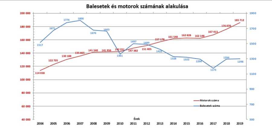 A forgalomban résztvevő összes motor és a kétkerekűeket érintő vétkes/vétlen balesetek száma. Az utóbbi 15 évben meredeken csökkent, viszont 2017 óta durván emelkedett az ütközések száma
