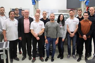 A Széchenyi István Egyetem új, integrált motorkerékpár- és versenyszakmérnök képzés oktatóiról, hallgatóiról, középen Talmácsi Gáborral. ...