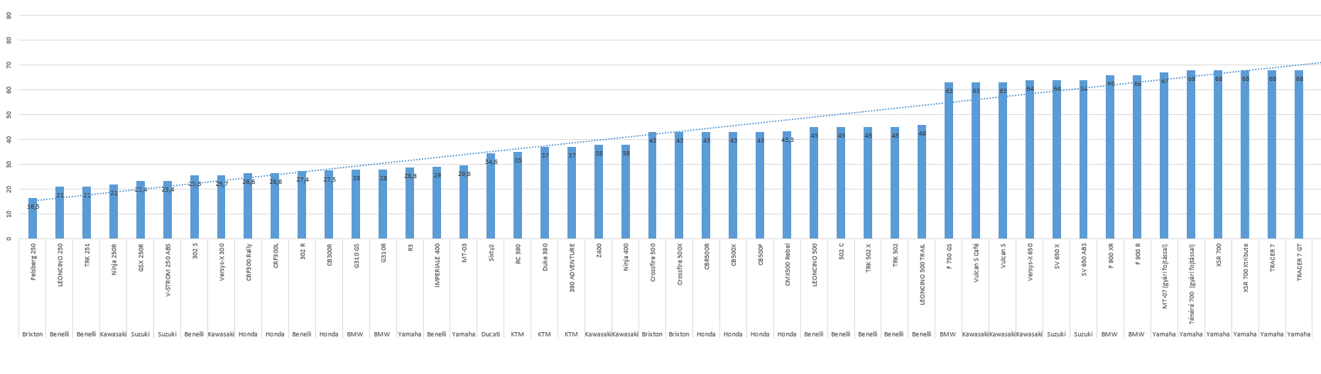 | Yamaha | MT-07 (gyári fojtással) | Csupasz | 689 cm3 | 35 kW | 184 kg | 67.0 Nm/6500 ford/perc | 2.398.000 Ft | ||