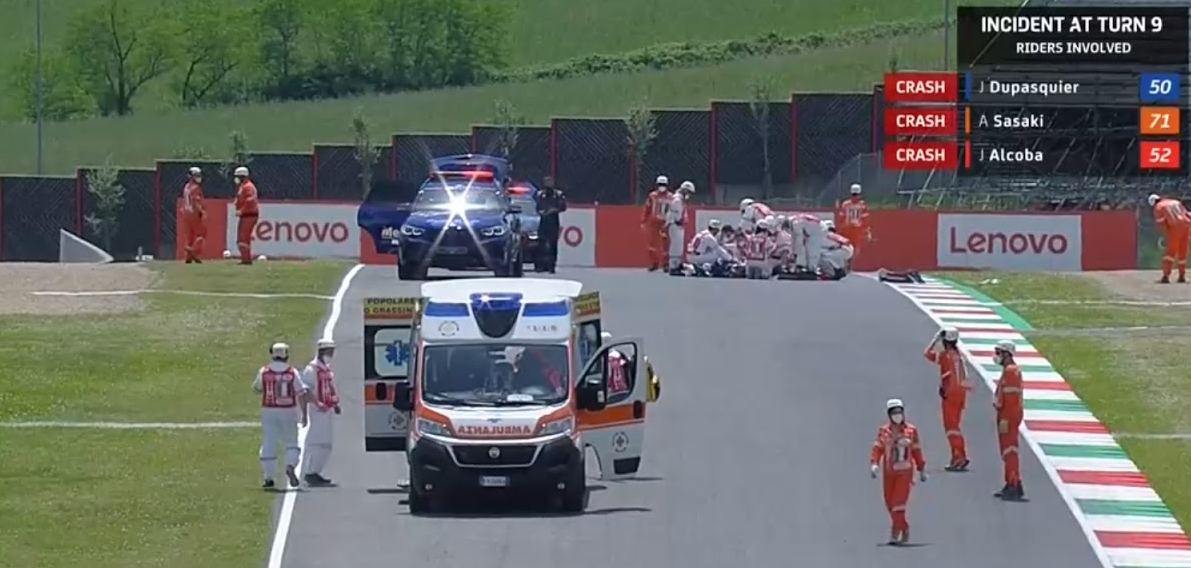 Frissítve: Sasaki komolyabb sérülések nélkül úszta meg az esést, de Dupasquiert mentőhelikopterrel kellett kórházba szállítani. Jobbulást kívánunk mindhárom pilótának!