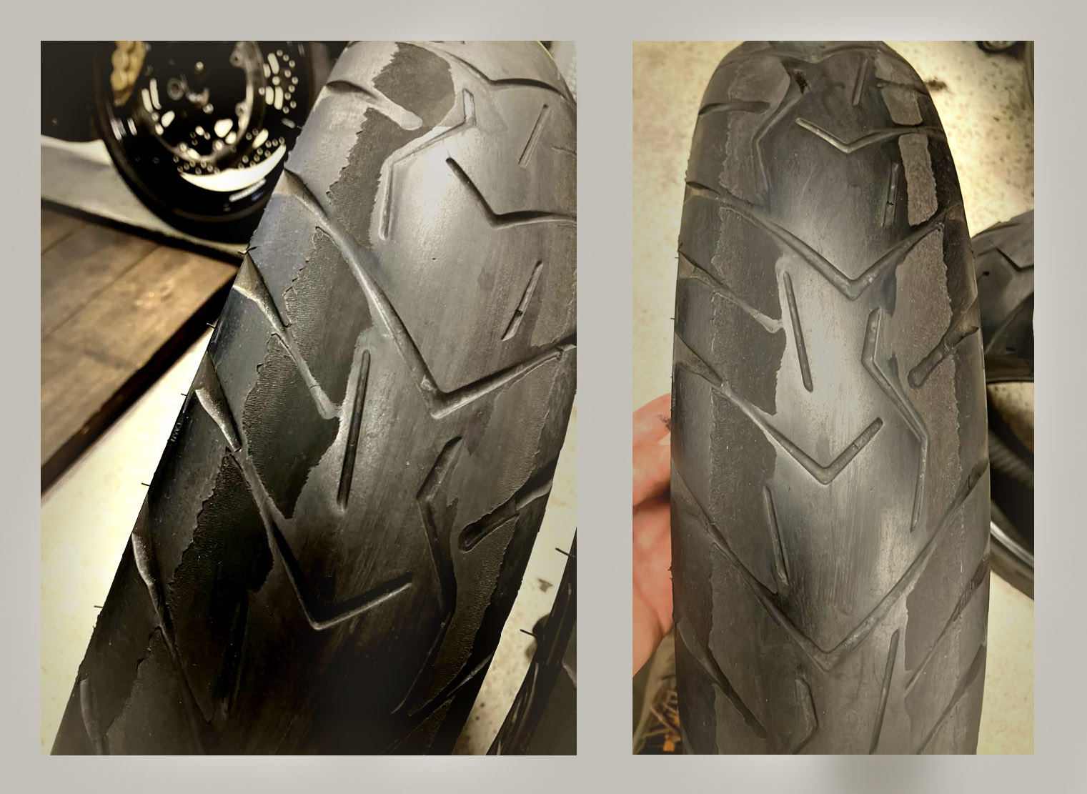 Az abroncsokkal nincs sok teendőd: amennyiben nincs sérülés, repedés és jó a mintamélység, csak tisztítsd meg őket, fújd fel az előírt értékre és meg is vagy. Amennyiben van ilyen első-hátsó emelőd, tárold azon a gépet, hogy tehermentesítsd a köpenyt és a felfüggesztést, de a pannóniás időkből fennmaradt tanács (kicsit le kell engedni a gumikat és néha átforgatni a kereket, hogy ne deformálódjon a köpeny) mára teljesen érvényét veszítette, tudniillik a radiálköpenyek sokkal kevésbé érzékenyek a deformálásra, mint a diagonális övszerkezetű ősök.