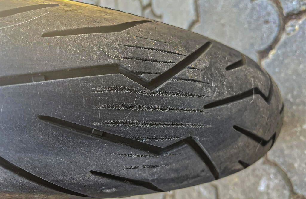 A motor egy Suzuki SV650, mely – ahogy a képen is látható – négyéves Pirelli Diablo Rosso III abroncsokat visel. Tulajdonosa nemrég arra figyelt fel, hogy 5-6 helyen, körben az első gumin (de csak azon) ilyen nyomok éktelenkednek a köpenyen. Vágásról nemigen lehet szó, hiszen a hátsó sértetlen, egyébként pedig zárt garázsban áll a vas, tehát kizárt, hogy valaki megpróbálta tönkretenni: