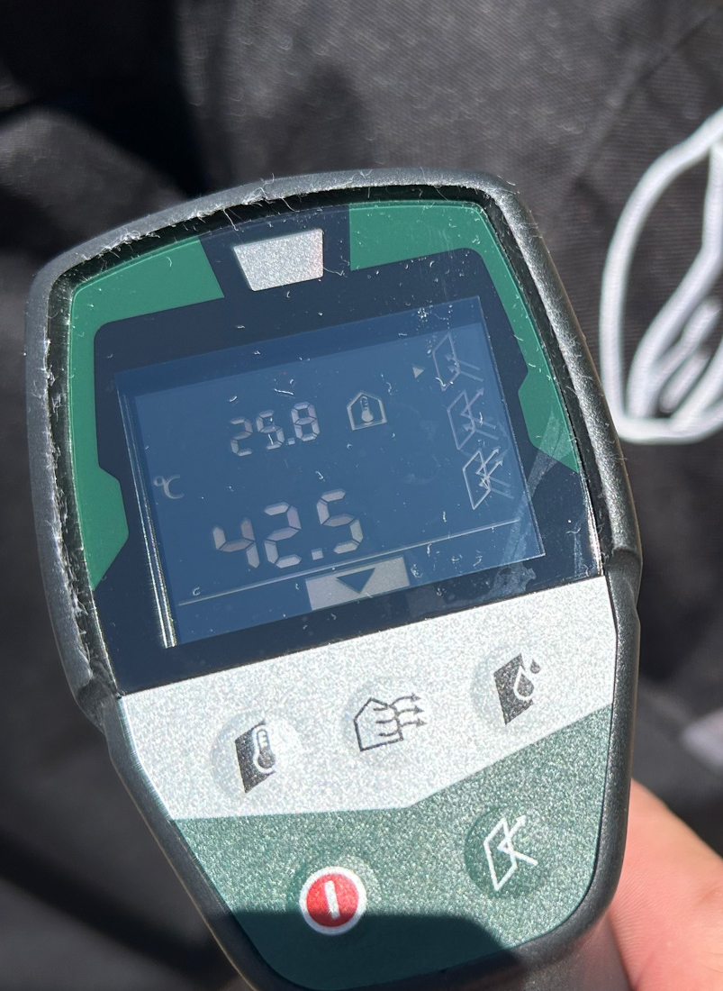Nos, egy lézeres felületi hőmérsékletmérővel megnéztem, hogy három különböző anyagú és színű kabát mennyire melegszik fel 15 perc alatt a déli napsütésben, ami egy sima sorbanállós/várakozós tankolás hozzávetőleges ideje.