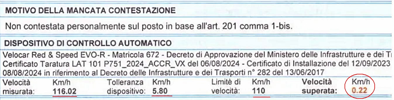 Azért jöhetett ki ilyen furcsa mért sebesség (110,22 km/óra), mert az úton 110 km/h volt a megengedett legmagasabb sebesség, a bírság címzettje 116,02-vel ment, amiből a kinti szabályok alapján 5,8 km/órát vonnak le afféle mérési pontatlanság (tolleranza dispositivo) címén. A Bild számolt be az esetről, de arra nem tért ki a cikk, hogy a „renitens száguldozó” befizette-e a bírságot vagy megpróbált a hatóságok jóindulatára hatni – elvégre tényleg csak 0,22 km/órás túllépésről van szó.