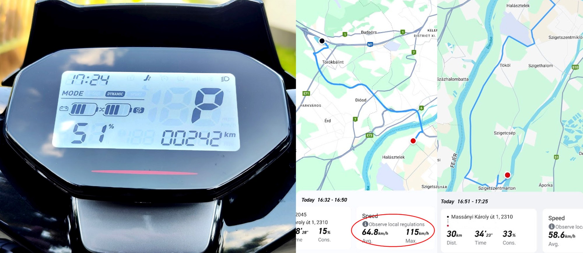 Az első komoly meglepetés akkor ért, amikor bevállaltam, hogy nem az elektronokkal spórolva és csak a hatótávra összpontosítva próbálom ki, hanem igenis autóúton/autópályán megyek vele, ahogy a benzinesekkel nap mint nap, gyorsulgatok a lámpáknál, egyébként pedig a forgalom tempójához igazítom a sebességem. Nos, tényleg szenzációs értéket produkált az FQi, ezért elmentettem a képernyőfotót a NIU GPS- és GSM-alapú nyomkövetőjéből, mert bemondásra talán én sem hinném el…