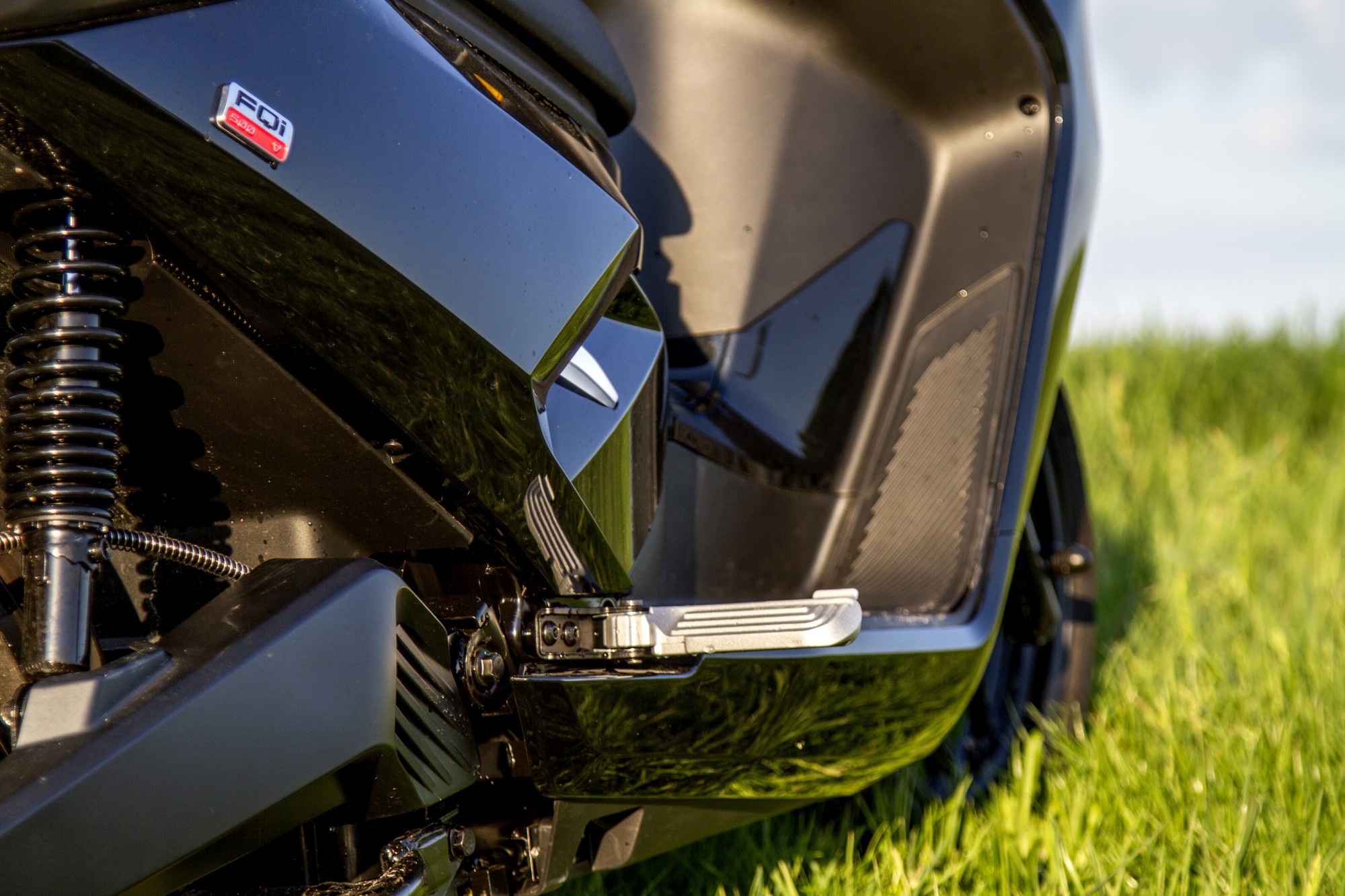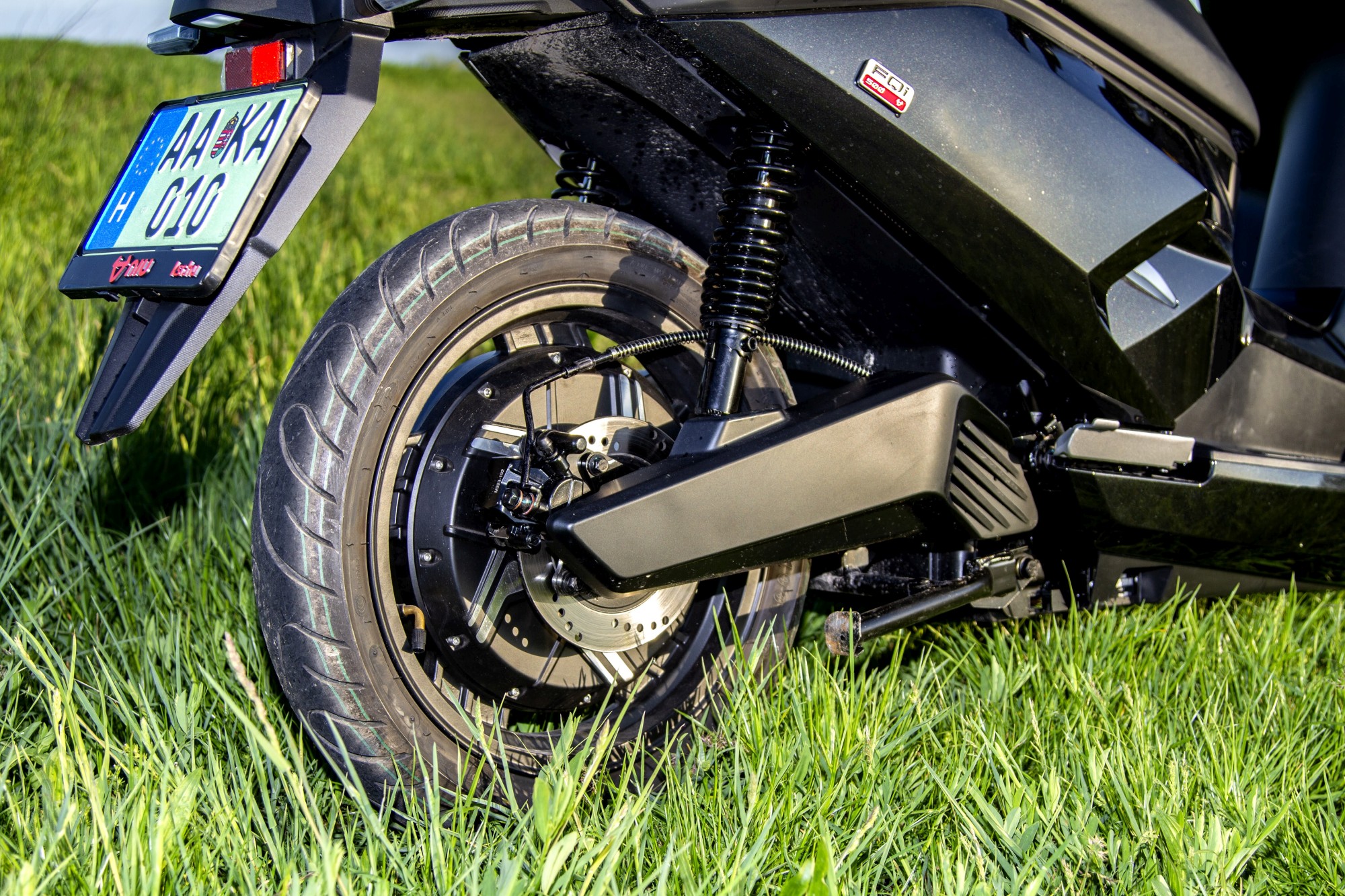 Ilyen teljesítményhez már minőségi fékrendszer és felfüggesztés dukál, ezért az FQi-n két tárcsa teljesít szolgálatot, amit utassal és csomaggal terhelve sem sikerült túlmelegíteni, pedig megannyi városi sprintet lenyomtunk a géppel. Hasonló a helyzet a futóművel is, azaz bőven túlméretezett, de ez esetben a túlméretezett annyit tesz, hogy igazából kétszemélyes használatra ideális. Mivel nincs különösebb állítási lehetőség, 75 kilós vezetővel, rossz úton haladva túl feszes a rugó-előfeszítés és a csillapítás is, de kétszeresére növelve a súlyt máris lágyan, mégis határozott csillapítással suhan át az úthibákon.