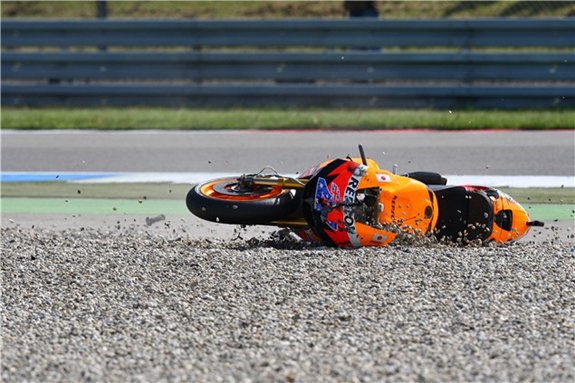 Assen nem kedvezett a HRC Hondáknak. Stoner nyitotta a sort, az ő esését szinte lemásolta Dovizioso, majd végül Aoyama - néhány perc alatt megsemmisült a teljes HRC csapat. A fotós nem is állhatott volna jobb helyen: tucatnyi képből álló diasorozatban örökítette meg az ausztrál versenyző bukását. ...